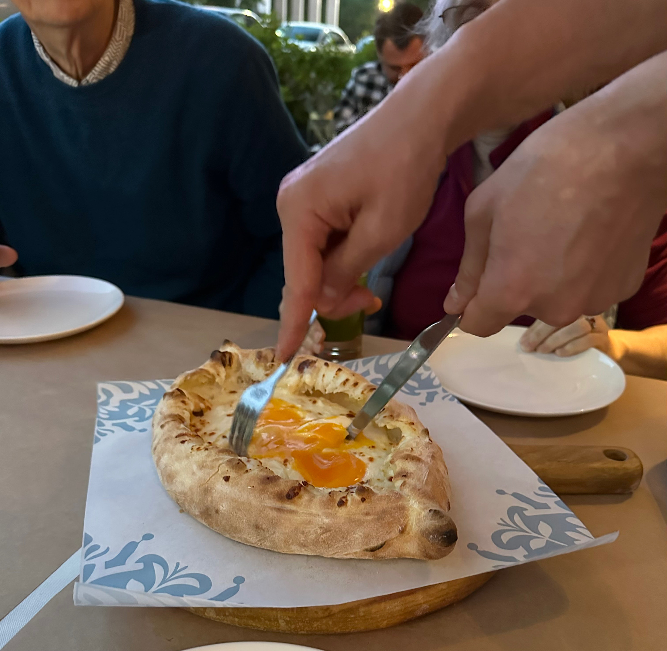 IMG_6215 Published May 3, 2025 at 2200 × 2145 in IMG_6215 ← Previous / Next → Adjarian. Sort of a pizza with an egg and cheese mixture. It is a popular Georgian appetizer.