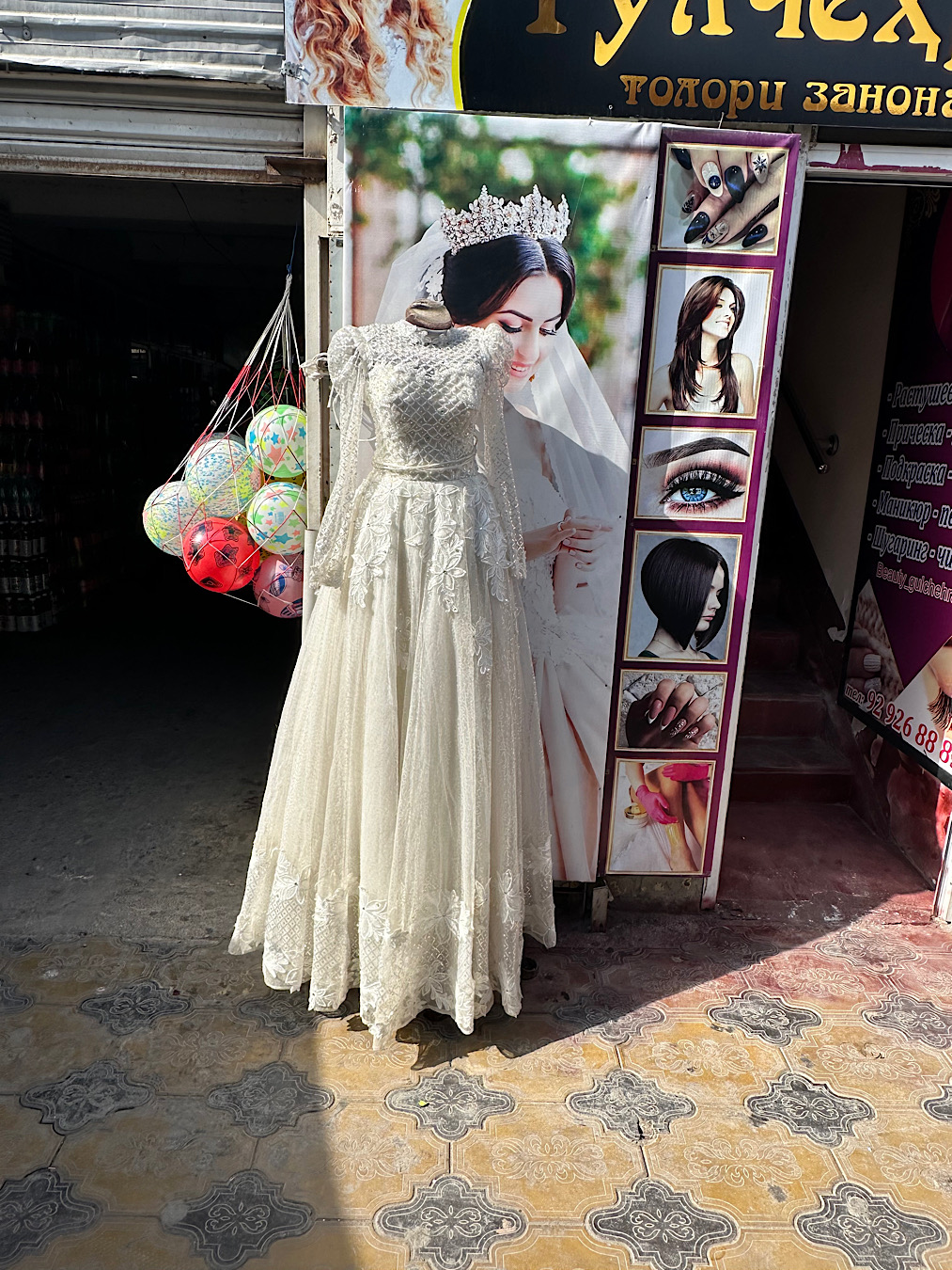 IMG_6782 Published June 2, 2025 at 1013 × 1350 in May 10, 2025: Our Quick Visit to Tajikistan (#3 of 5). ← Previous / Next → Need a soccer ball or wedding dress? Shops next to the bazaar are ready to sell you them.