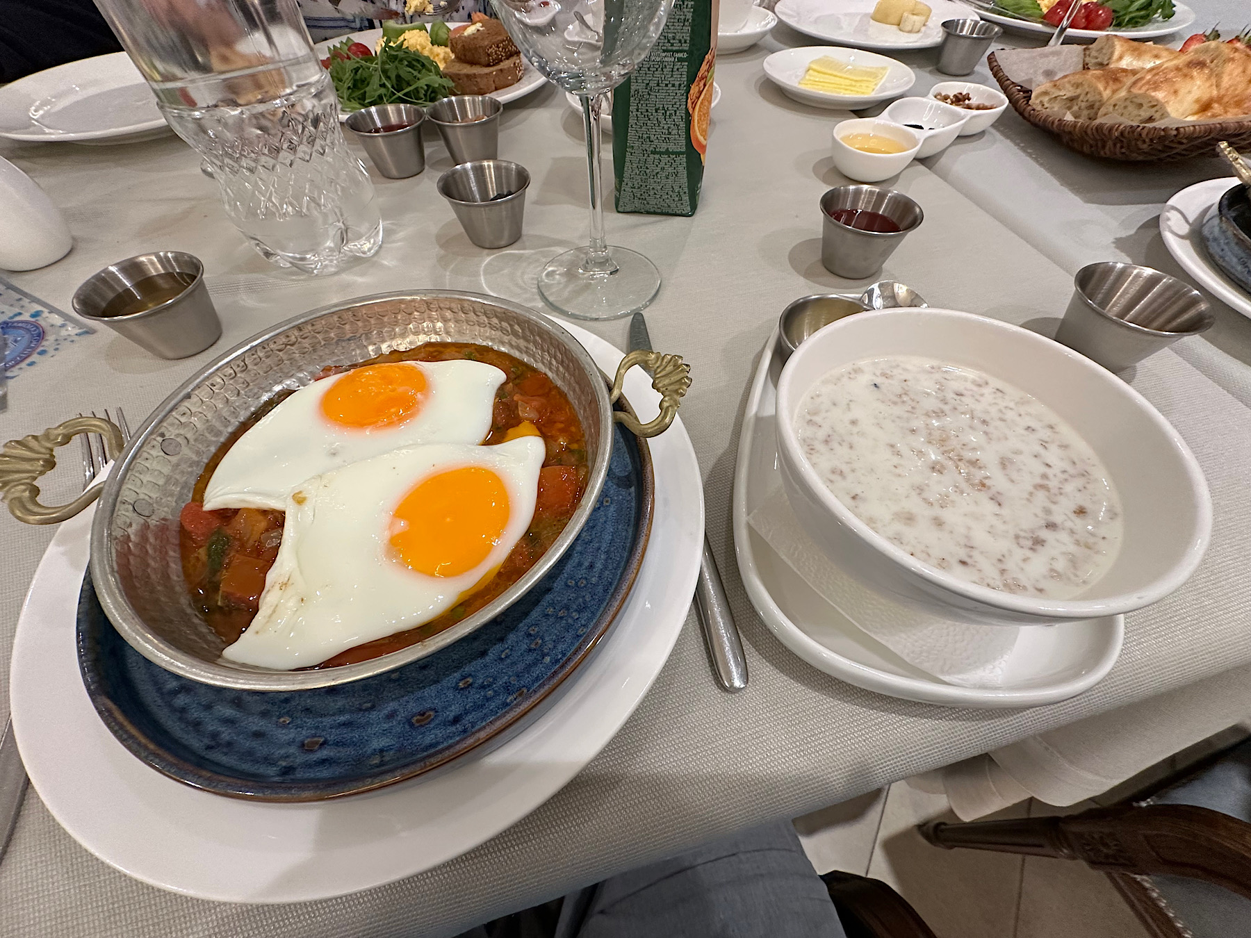 IMG_6802 Published June 4, 2025 at 1800 × 1350 in May 11, 2025: Back to Touring Uzbekistan ← Previous / Next → A surprise at breakfast- shakshuka and a very tasty porridge.