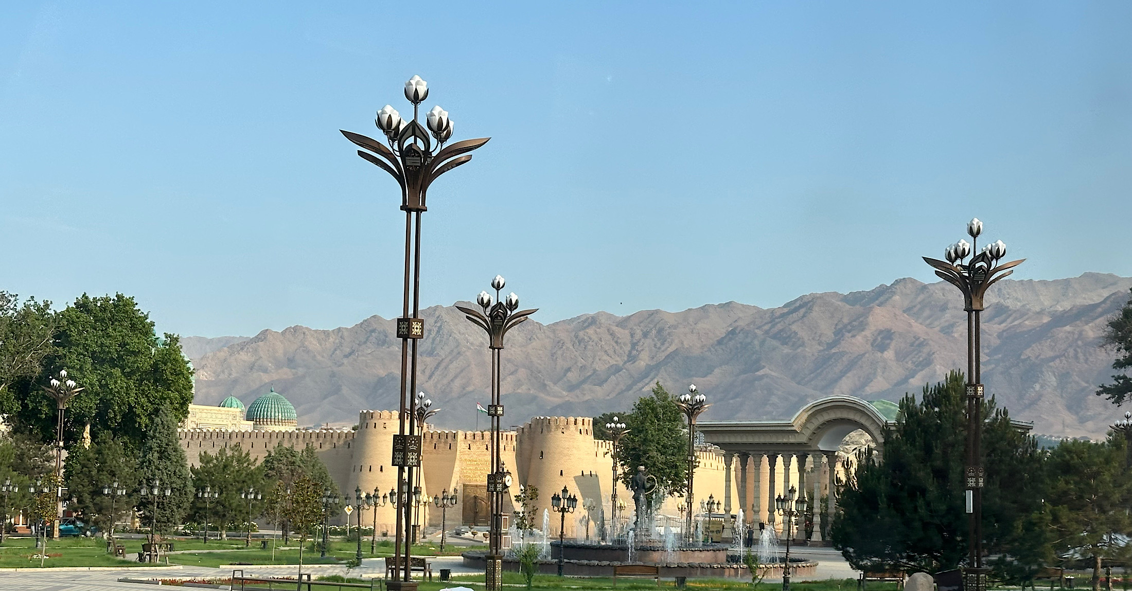 IMG_6805 Published June 4, 2025 at 2200 × 1149 in May 11, 2025: Back to Touring Uzbekistan ← Previous / Next → An early morning showing the nearby mountain range behind the rebuilt Timur fortress.