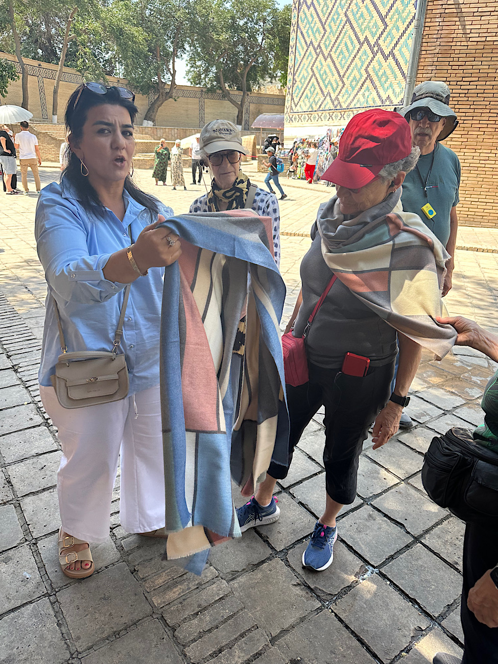 IMG_6887 Published June 8, 2025 at 975 × 1300 in May 12, 2025: Exploring Samarkand in Southern Uzbekistan. ← Previous / Next → Locals trying to sell us camel wool shawls.