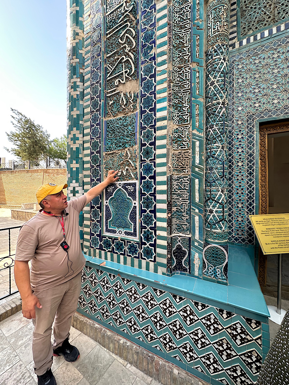IMG_6914 Published June 10, 2025 at 975 × 1300 in May 12, 2025: Exploring Samarkand in Southern Uzbekistan. ← Previous / Next → Furkat explaining a bit about the ceramic tile design.