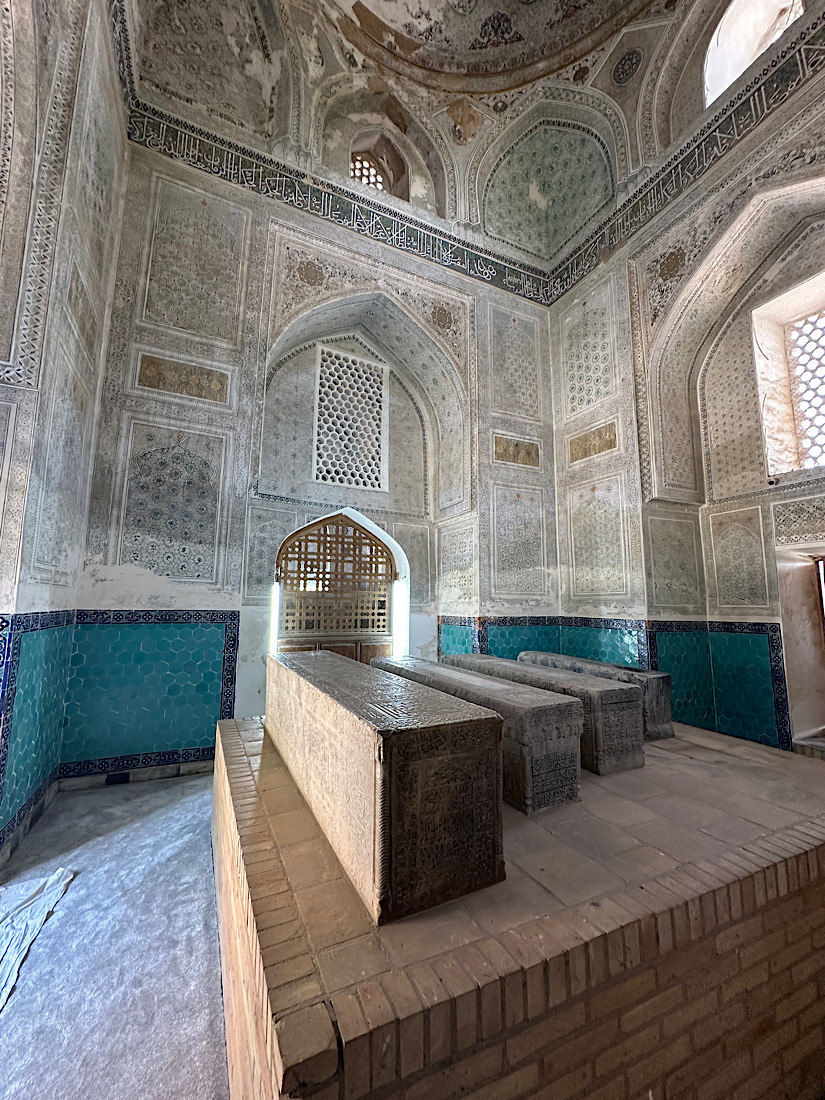 IMG_6979 Published June 12, 2025 at 825 × 1100 in May 13, 2025: Road Trip to Shakhrisabz, the Birthplace of Timur ← Previous / Next → Inside the Gumbazi Sayidon Mausoleum. Built by Ulugbek in 1437, and thought to be for his family. However, they really do not know who is buried there!
