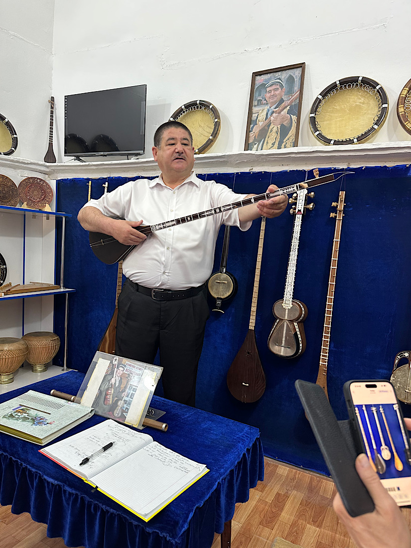 IMG_7034 Published June 13, 2025 at 825 × 1100 in May 14, 2025: Going to the Ancient City of Bukhara. ← Previous / Next → One of the former rooms held a music store where this musician makes and sells instruments. He played the different ones for us.