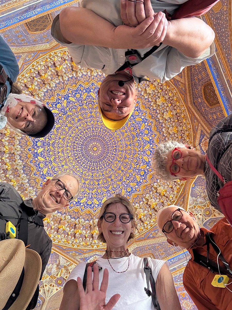 IMG_7046 Published June 13, 2025 at 900 × 1200 in May 14, 2025: Going to the Ancient City of Bukhara. ← Previous / Next → Having a bit of fun as Maddie took a picture of the dome with us photobombing.