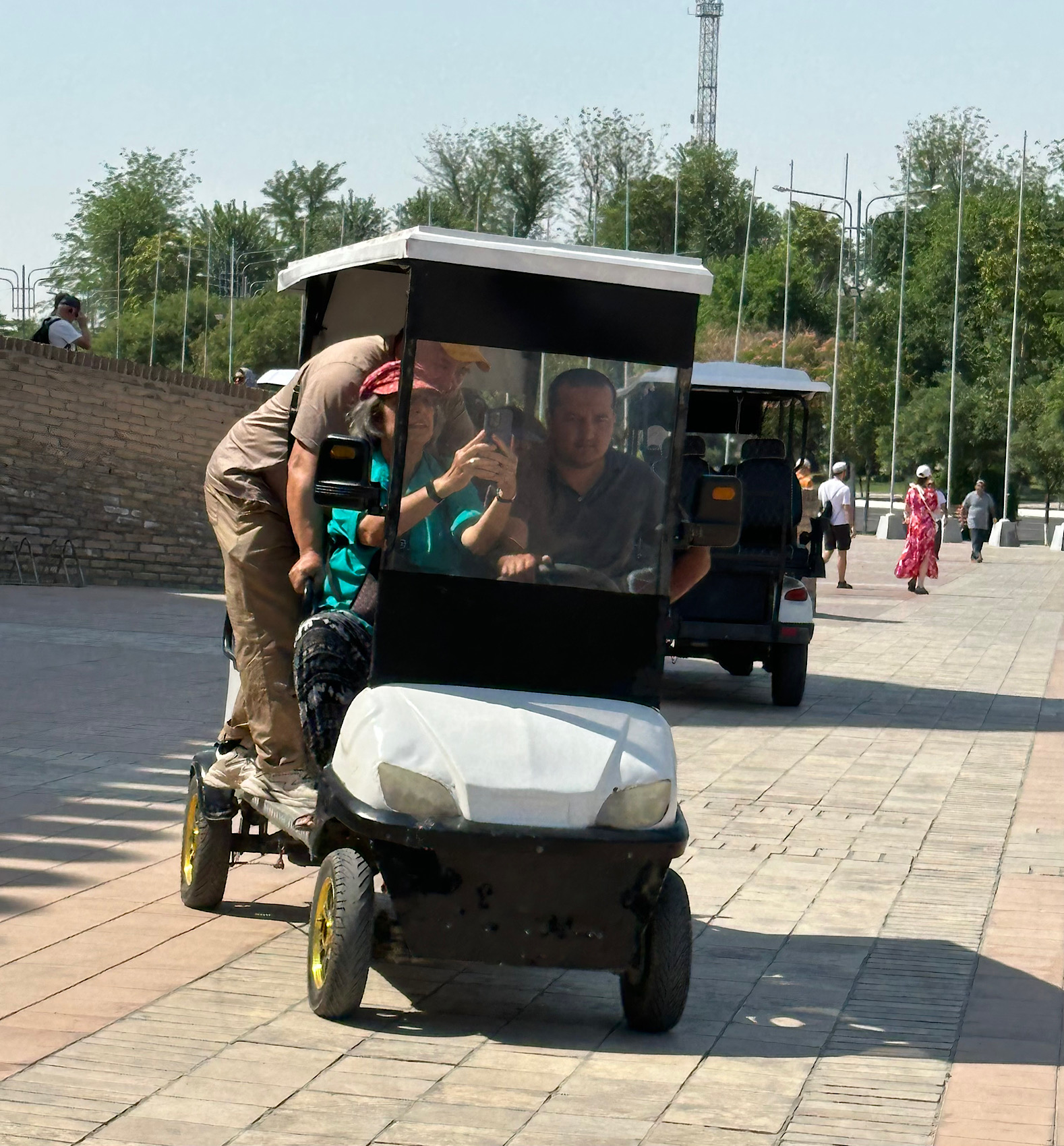 IMG_7134 Published June 15, 2025 at 1578 × 1700 in May 14, 2025: Going to the Ancient City of Bukhara. ← Previous / Next → It was hot already and the Zindon prison was a bit away so Furkat hired these golf carts to take us there rather than having to walk. Thanks, Furkat.