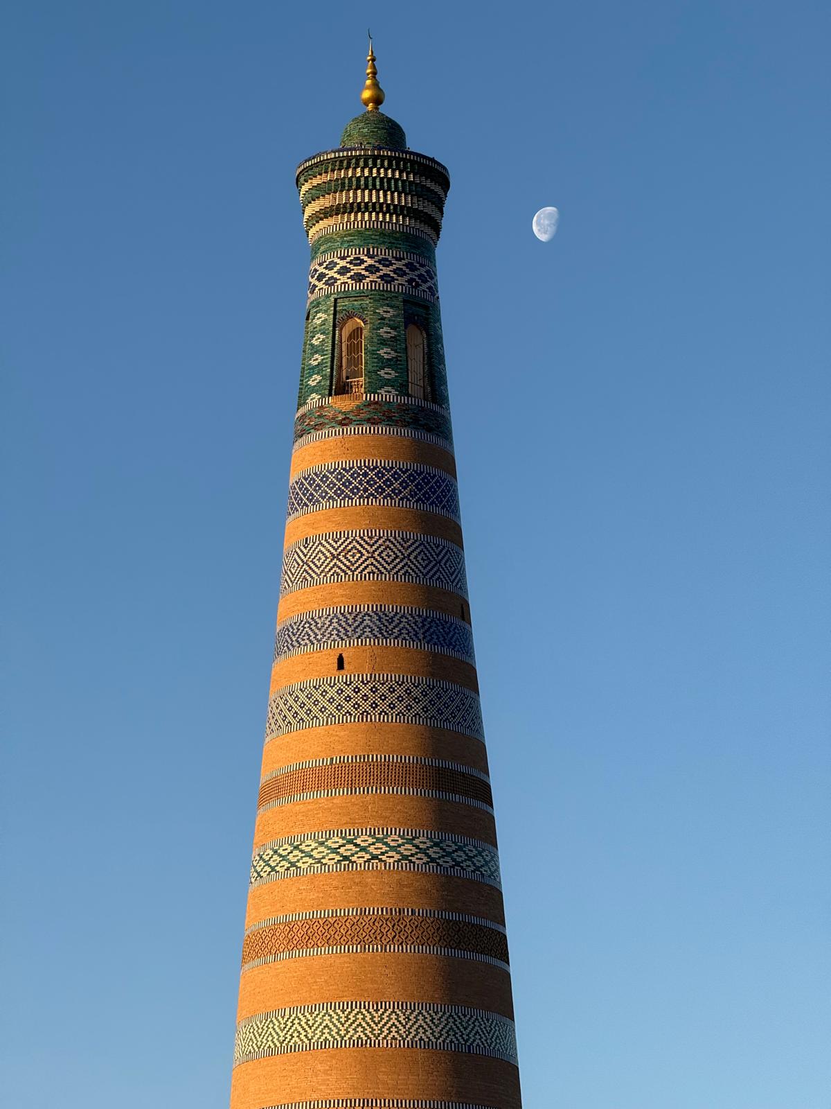329e6874-354d-43fc-85e6-651d2082fccc Published June 22, 2025 at 1200 × 1600 in May 18, 2025: Exploring the Ancient City of Khiva ← Previous / Next → The Islam Khodja Minaret, 50.5 meters high, was built in 1908-1910. It is next to the madrasah of the same name.. the decor supposedly represents the four seasons and the 12 months.