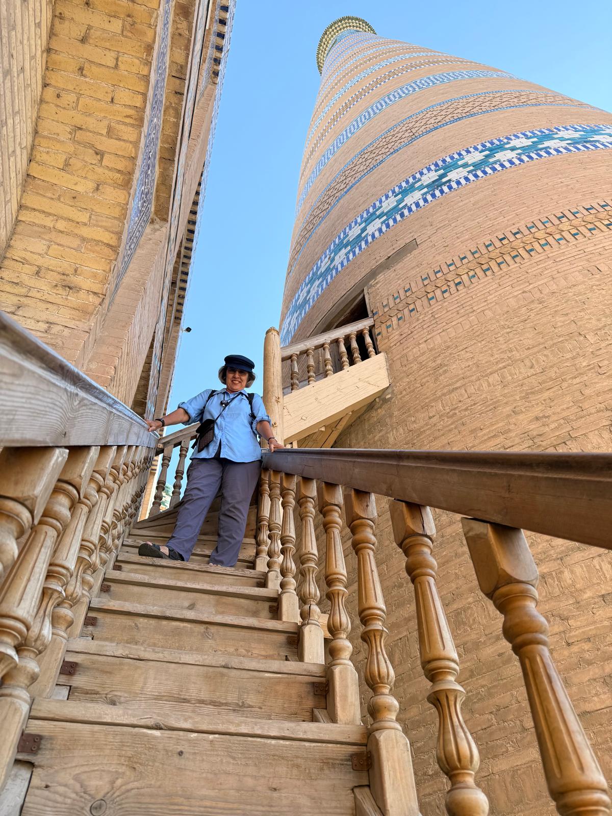 ec5e69d2-21c2-425b-badb-2e040b872f4d Published June 23, 2025 at 1200 × 1600 in May 18, 2025: Exploring the Ancient City of Khiva ← Previous / Next → Suki, a pharmacy professor from New Orleans, sacrificed her body by walking to the top of the minaret to take photos which she kindly shared with us.