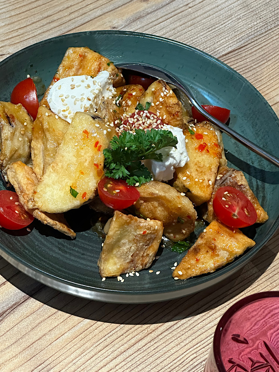 IMG_7495 Published June 24, 2025 at 900 × 1200 in May 18, 2025: Exploring the Ancient City of Khiva ← Previous / Next → Potatoes, eggplant and fresh yoghurt.