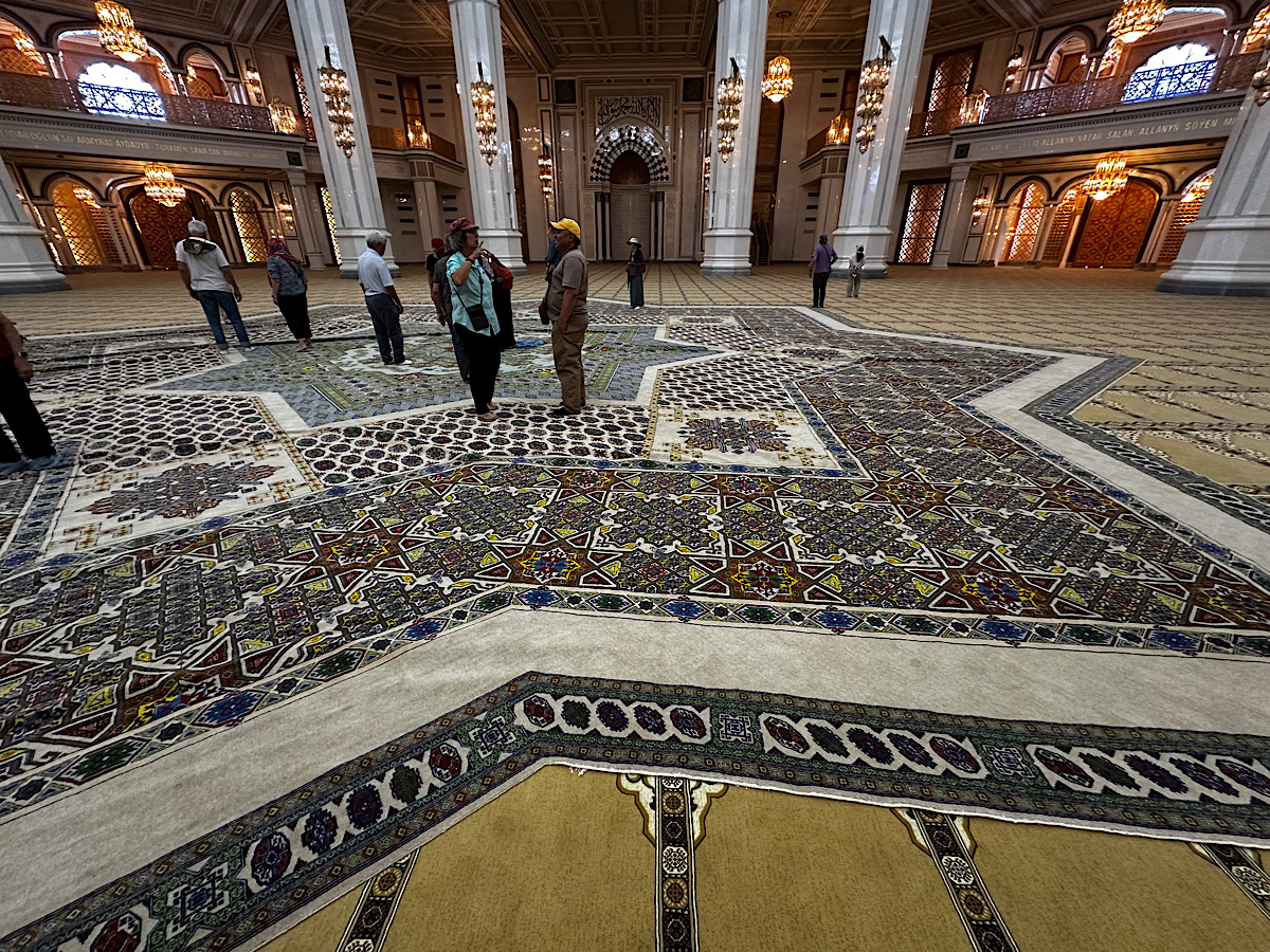 IMG_7641 Published July 15, 2025 at 1200 × 900 in May 21, 2025: Exploring Ashgabat and Its Surroundings. ← Previous / Next → A huge hand made carpet covers the floor in the center of the mosque.