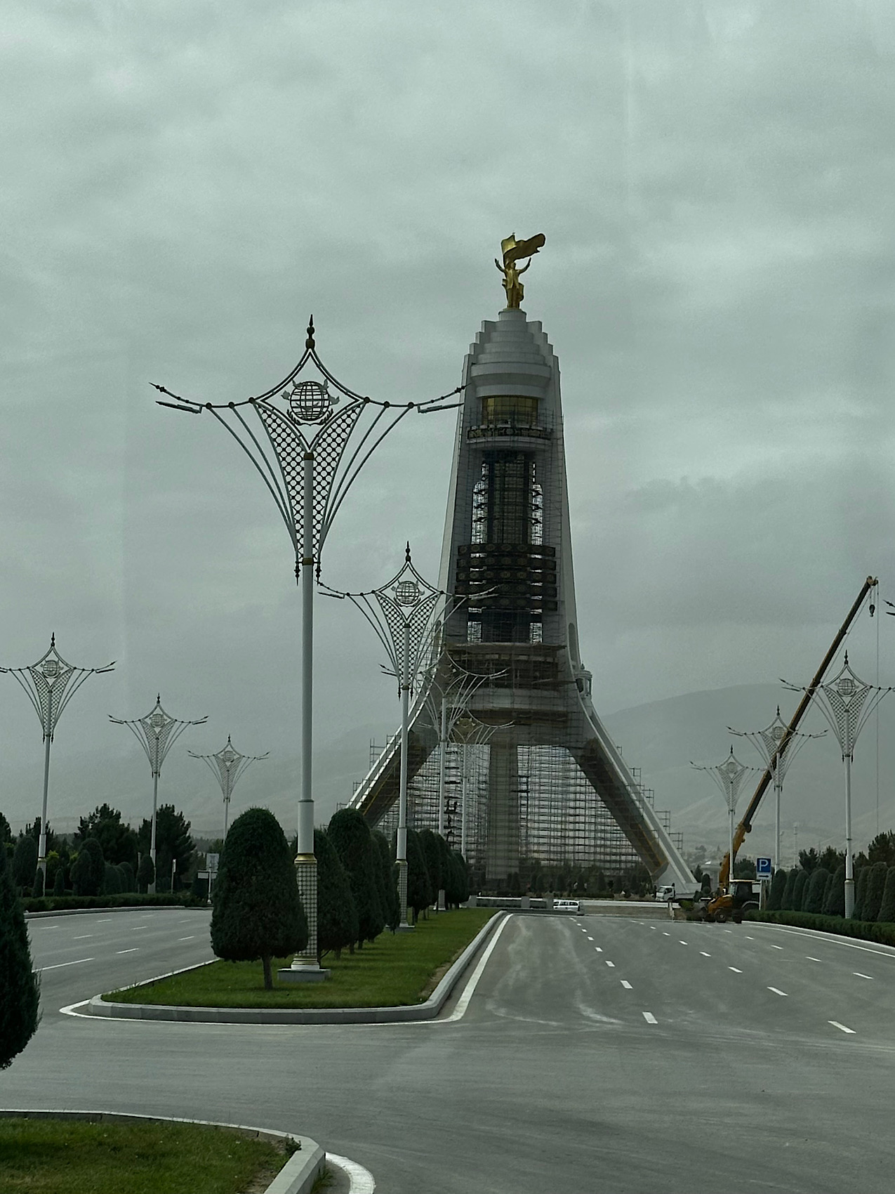 IMG_7852 Published July 17, 2025 at 1275 × 1700 in May 22, 2025: A Visit to the Ancient City of Merv. ← Previous / Next → A statue of gold honoring the president. The road was closed preventing us from getting closer.