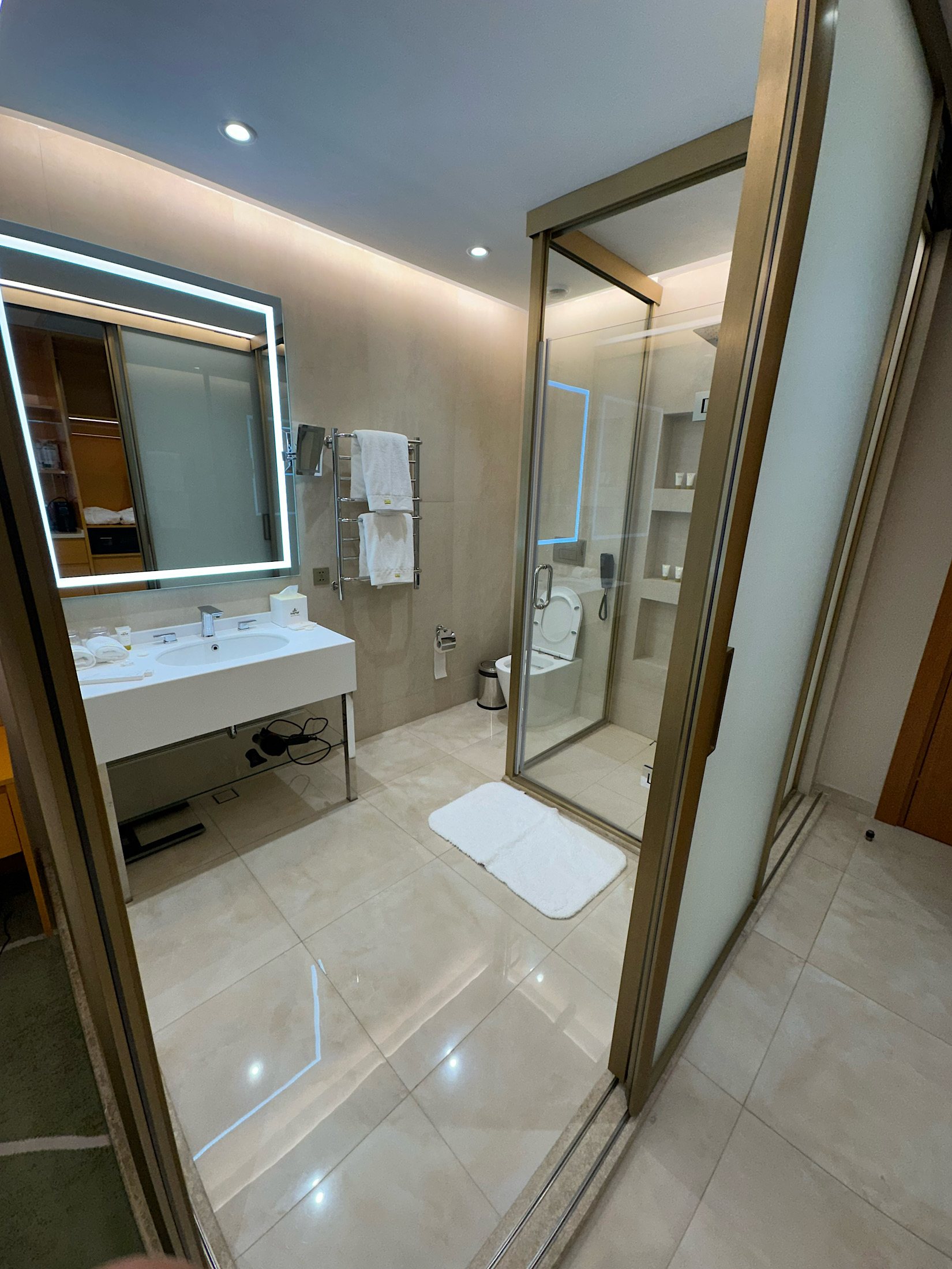 IMG_6380 Published May 10, 2025 at 1650 × 2200 in May 5, 2025: On Our Way to Kyrgyzstan, the Next “Stan” on Our List! ← Previous / Next → A funky bathroom with sliding glass walls on two sides. Kind of a weird setup.