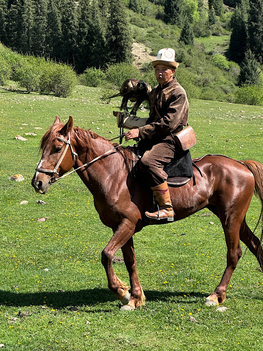 IMG_6486 Published May 16, 2025 at 900 × 1200 in May 6, 2025: Exploring Kyrgyzstan. ← Previous / He rode off a distance with the eagle. His assistant, on another horse, began dragging the decoy on the ground. The eagle was released and flew at and landed (hard) on the decoy.