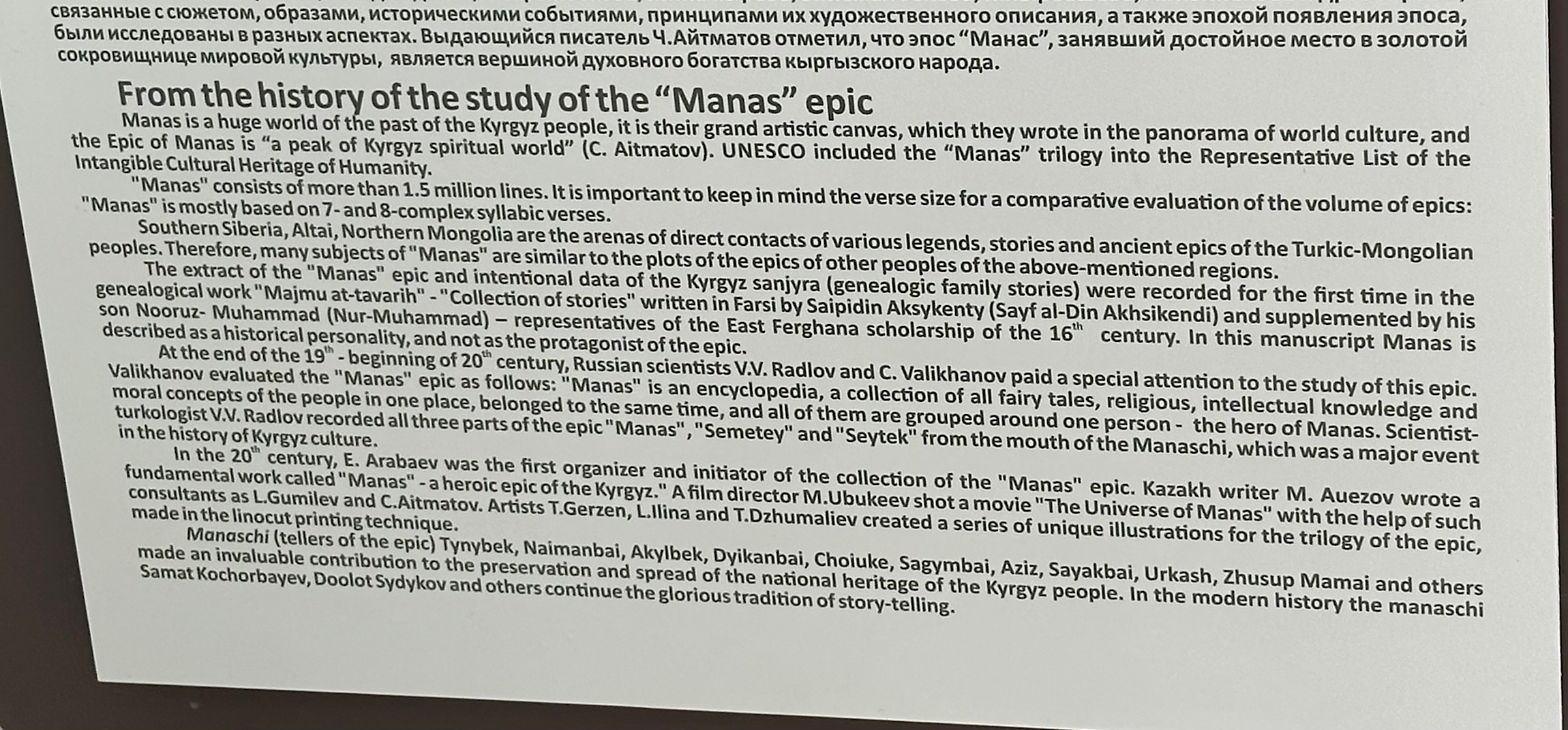 IMG_6498 Published May 18, 2025 at 2300 × 1072 in May 7, 2025: More Exploration of Kyrgyzstan. ← Previous / Next → Manas was a legendary hero and his poem was passed down from generation to generation. They had no written language.
