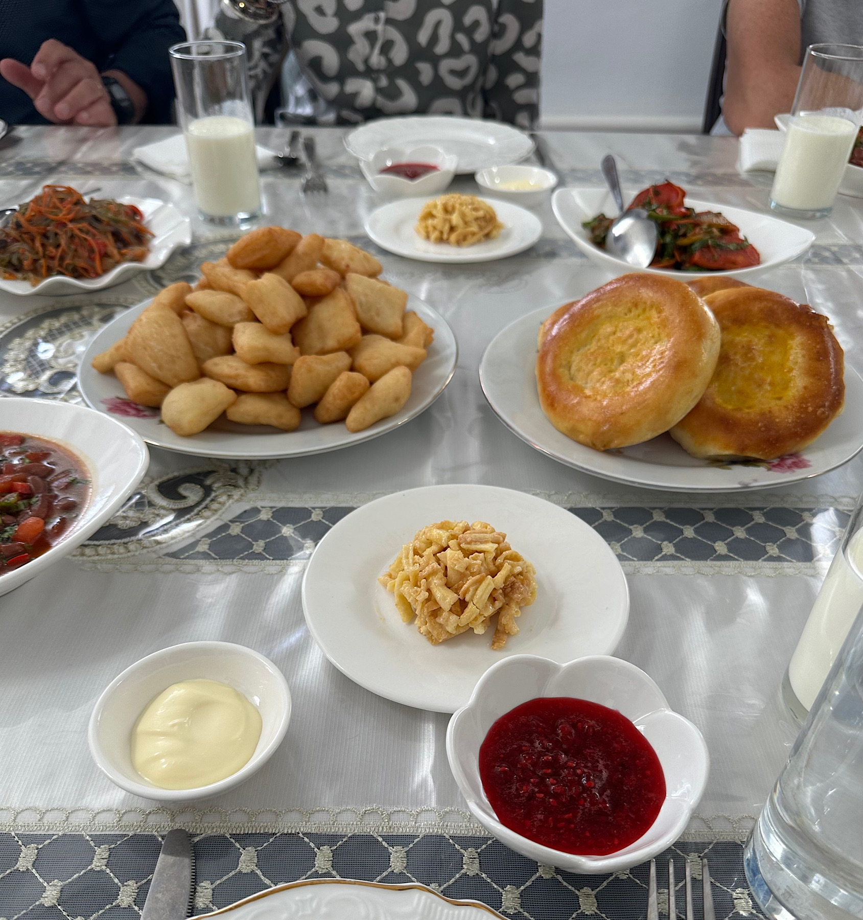 IMG_6541 Published May 19, 2025 at 1689 × 1800 in May 7, 2025: More Exploration of Kyrgyzstan. ← Previous / Next → Multiple salads, breads, appetizers, fresh yogurt filled the table