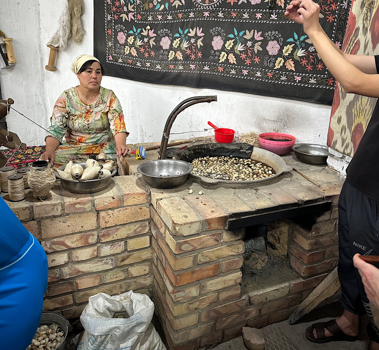 IMG_6717 Published June 1, 2025 at 1300 × 1201 in May 9, 2025: Seeing What Uzbekistan is All About. ← Previous / Next → Showing how the cocoons are converted into silk thread.