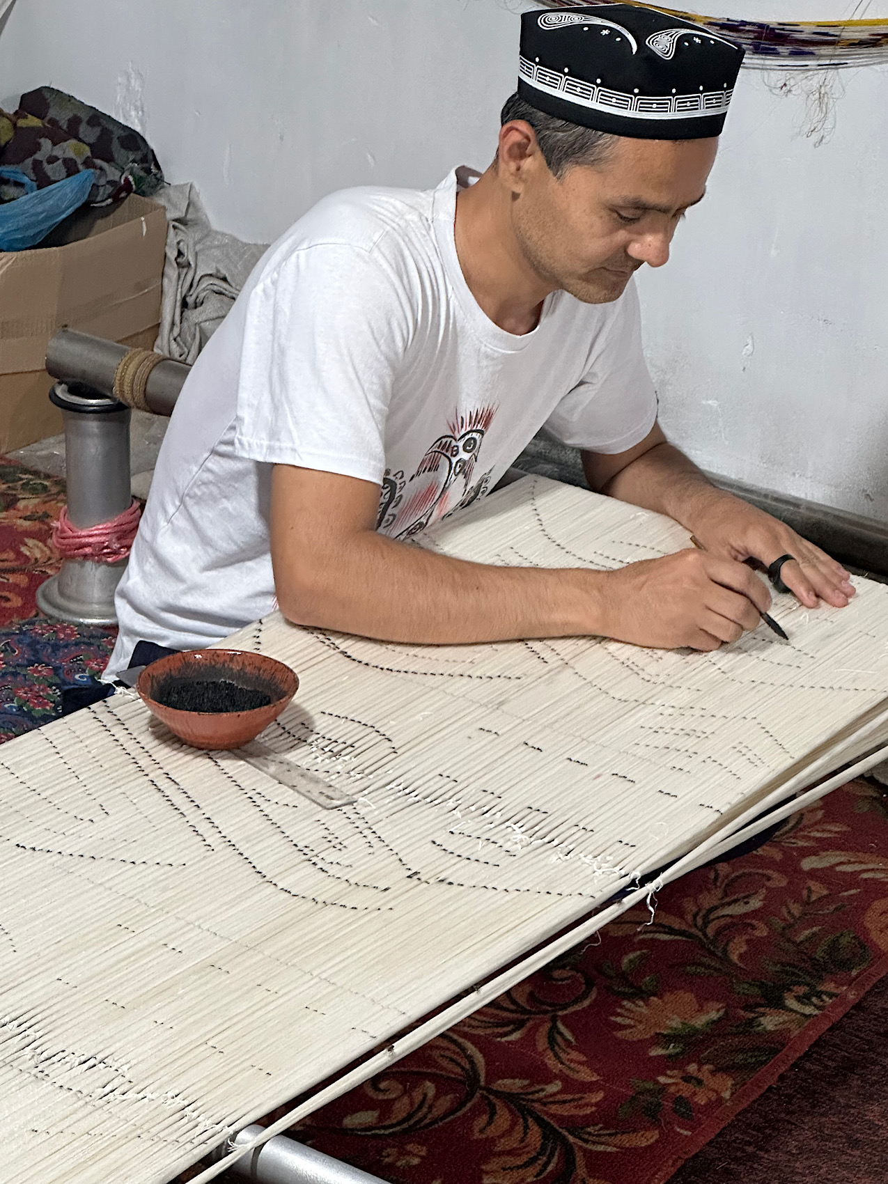 IMG_6719 Published June 1, 2025 at 1275 × 1700 in May 9, 2025: Seeing What Uzbekistan is All About. ← Previous / Next → Creating the design for the silk weaving.