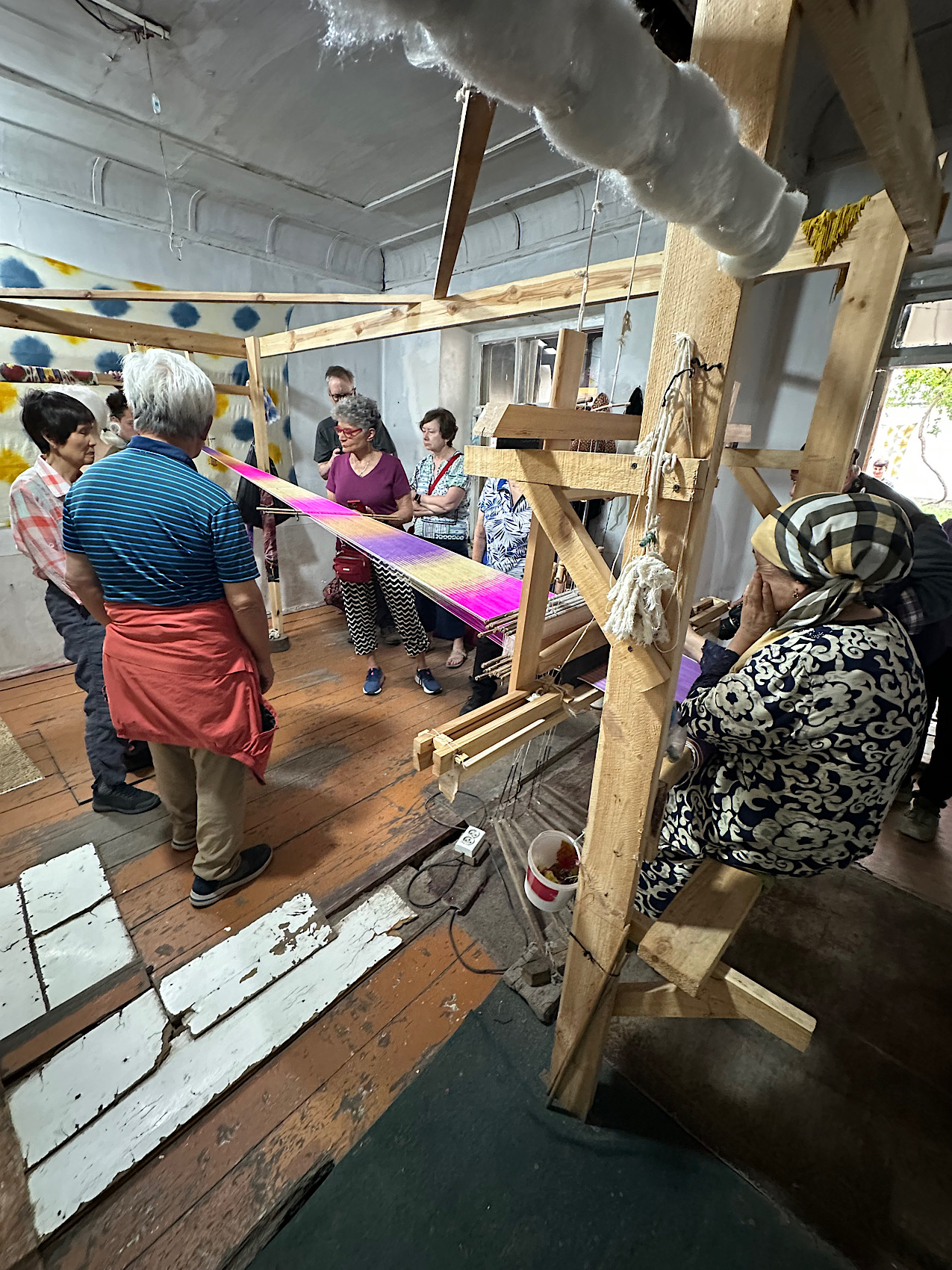 IMG_6720 Published June 1, 2025 at 1275 × 1700 in May 9, 2025: Seeing What Uzbekistan is All About. ← Previous / Next → Weaving the silk into a final product.
