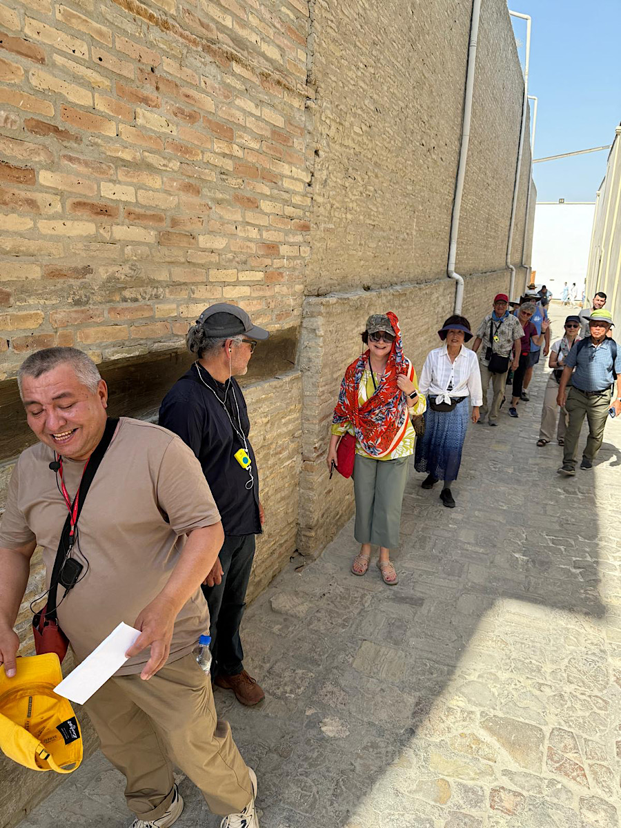 IMG_7187 Published June 16, 2025 at 900 × 1200 in May15, 2025: Exploring the Ancient City of Bukhara ← Previous / Next → Walking back after lunch. Note how we all are trying to walk in the shade!