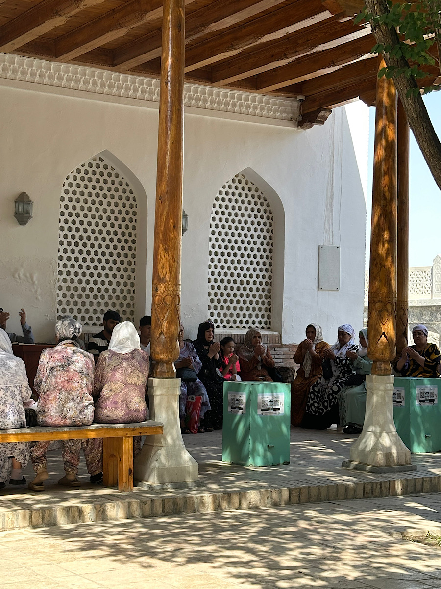 IMG_7234 Published June 17, 2025 at 900 × 1200 in May15, 2025: Exploring the Ancient City of Bukhara ← Previous / Next → Women participating in a morning prayer service outside a mosque.