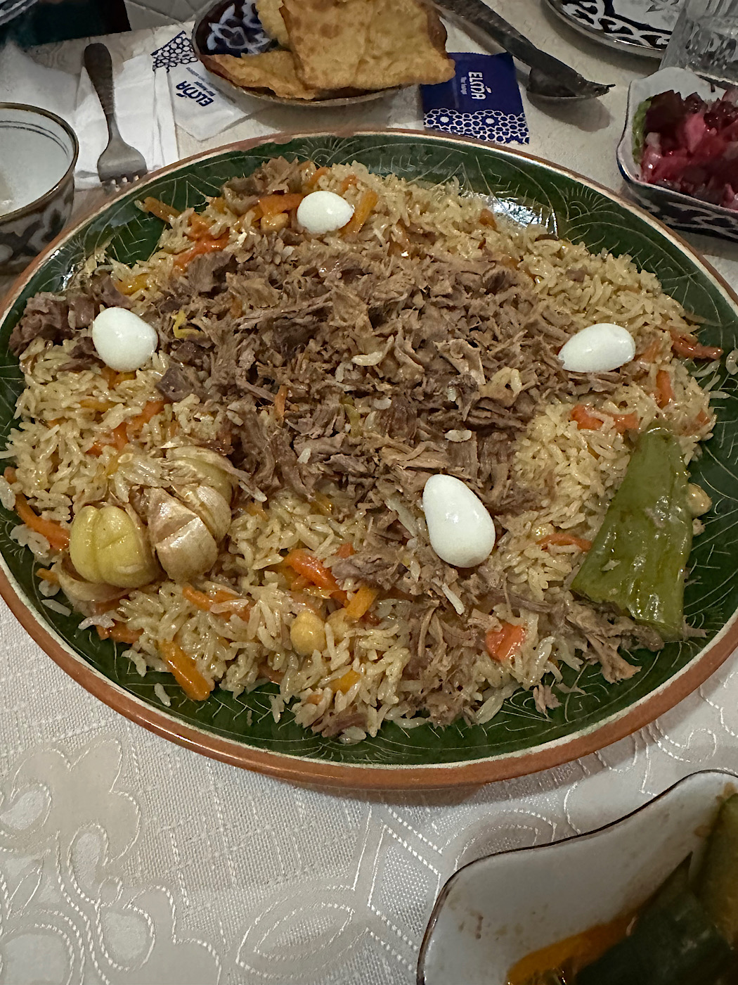 IMG_7261 Published June 17, 2025 at 1050 × 1400 in May15, 2025: Exploring the Ancient City of Bukhara ← Previous / Next → Plov, the national dish of Uzbekistan.those are quail eggs as decor.
