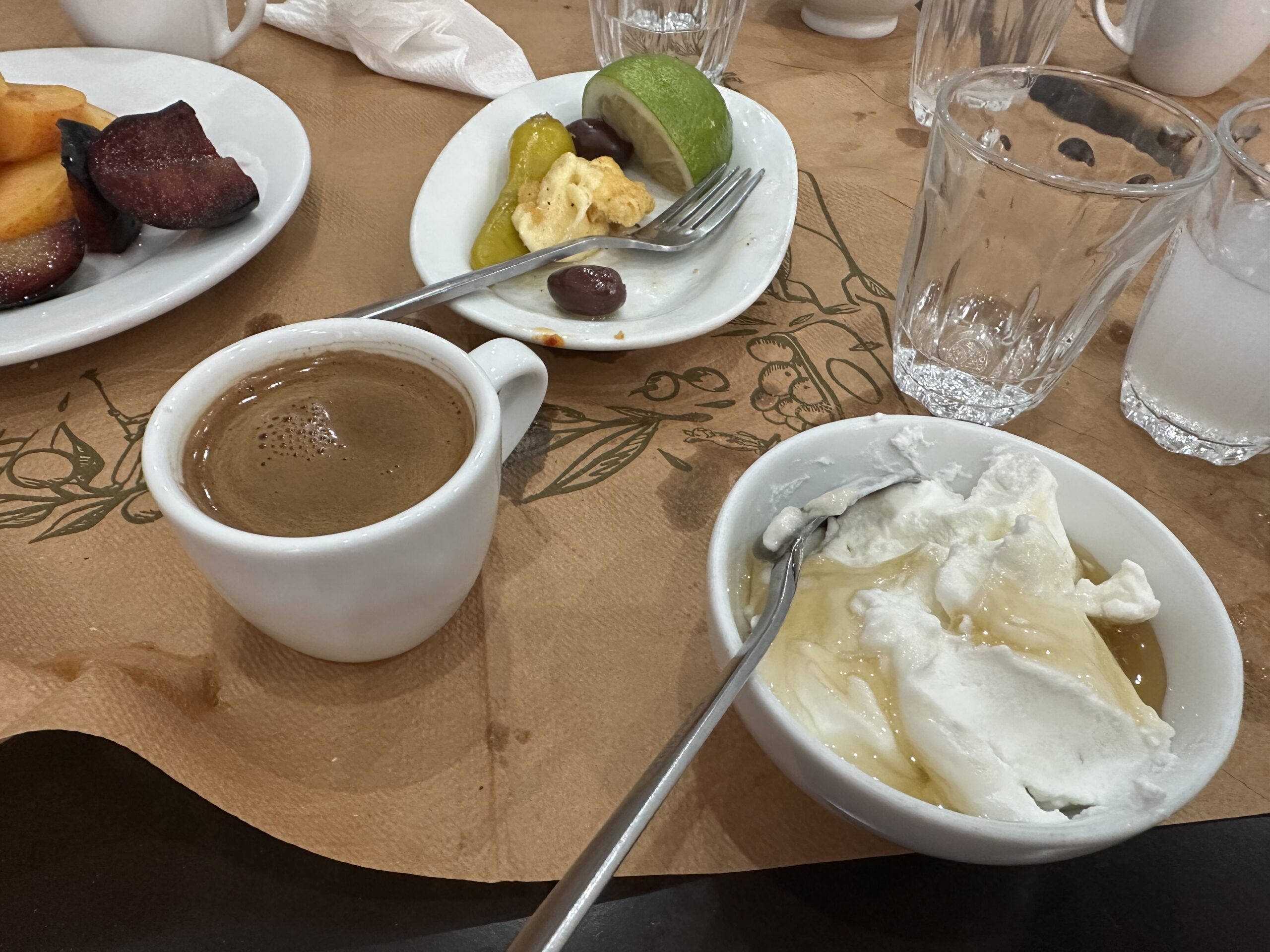 IMG_7526 Published October 26, 2025 at 2560 × 1920 in October 13-14, 2025: Leaving on a Jet Plane! ← Previous / Next → It is not a Greek meal unless there is ouzo (white liquid in glass), Greek yogurt with honey, fresh fruit (plums) and Greek coffee.