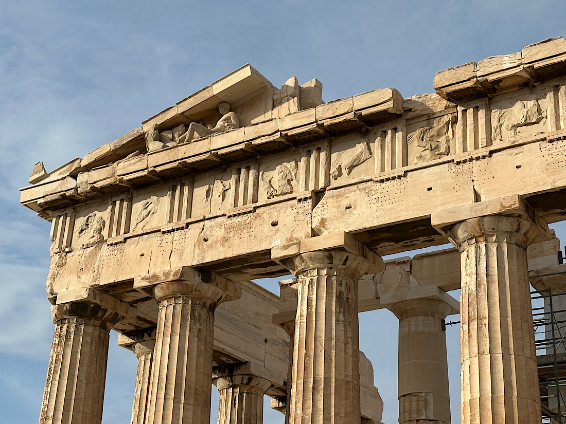 IMG_8145 Published October 26, 2025 at 1100 × 825 in October 15, 2025: Food Tour of Athens ← Previous / Next → Close up of the upper portion of the temple.