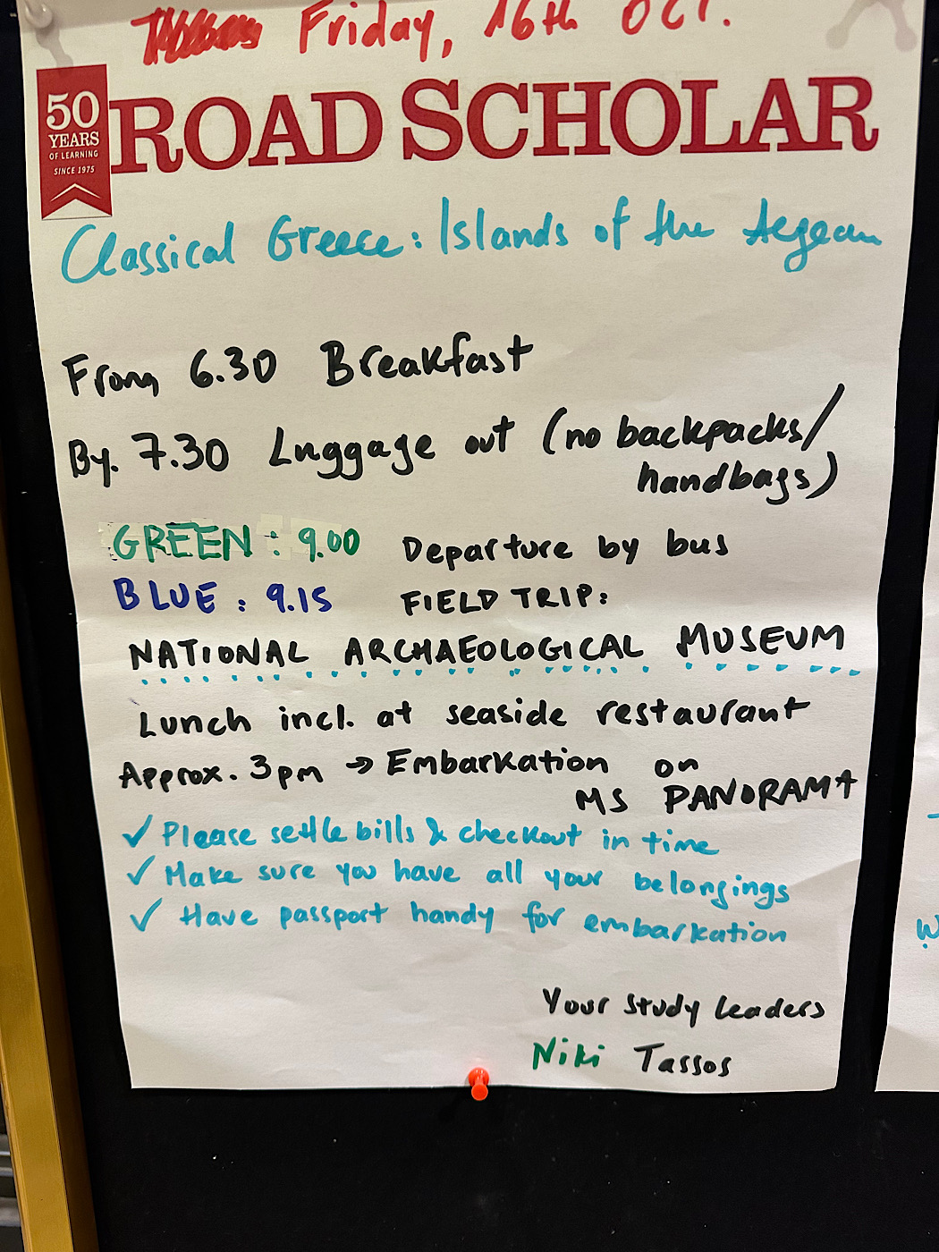 IMG_8191 Published October 26, 2025 at 1050 × 1400 in October 15, 2025: Food Tour of Athens ← Previous / Next → Niki posted a daily agenda the evening before so we knew the game plan for the day.