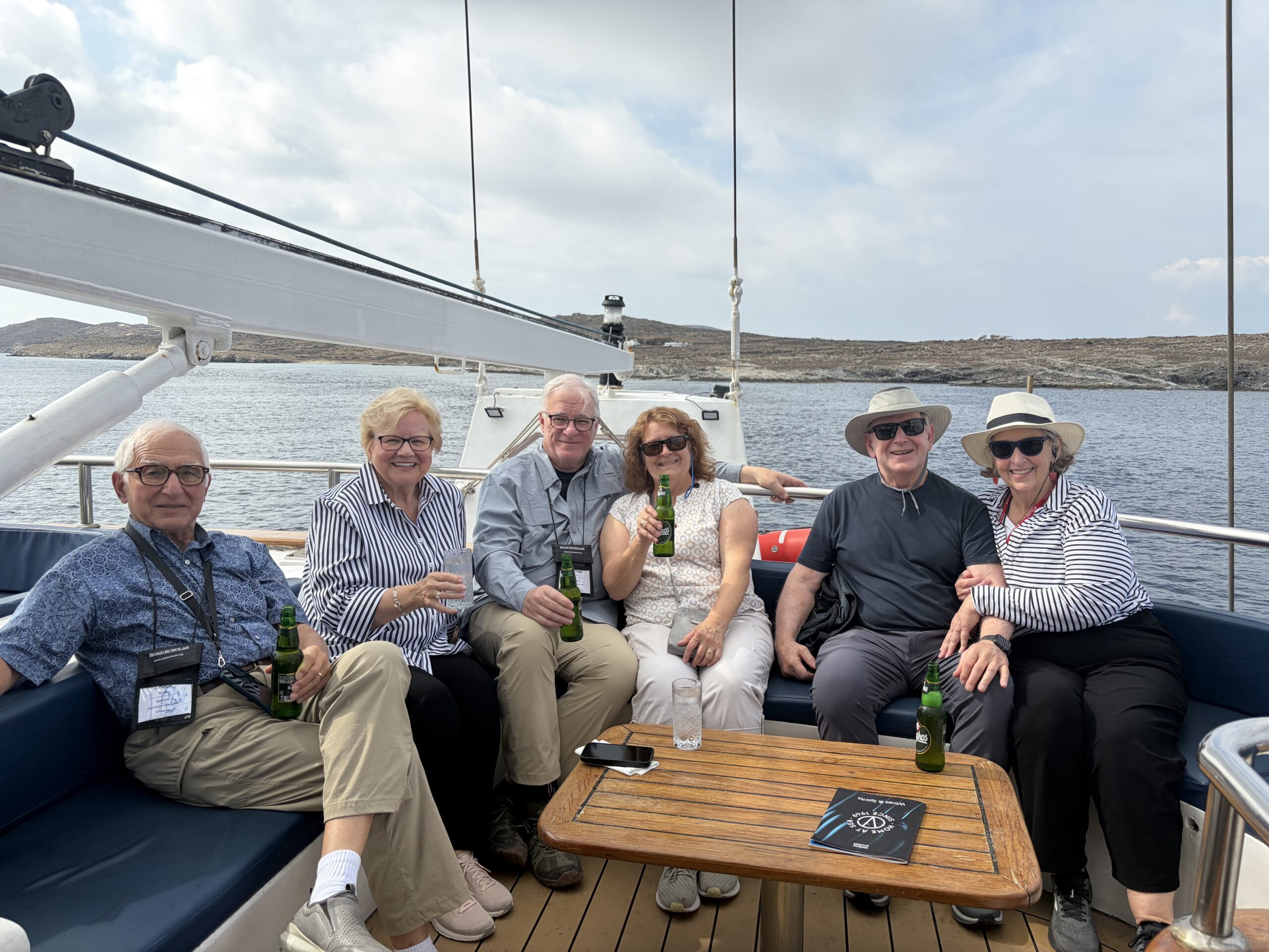 IMG_4624 Published November 2, 2025 at 2560 × 1920 in October 18, 2025: The Greek god, Apollo, and Windmills! ← Previous / Our group enjoying the sun and a beverage as we sail to Mykonos. L-R Chuck & Yvonne Bishop, Michael & Sheri Flynn, John & Elizabeth Kozleski.