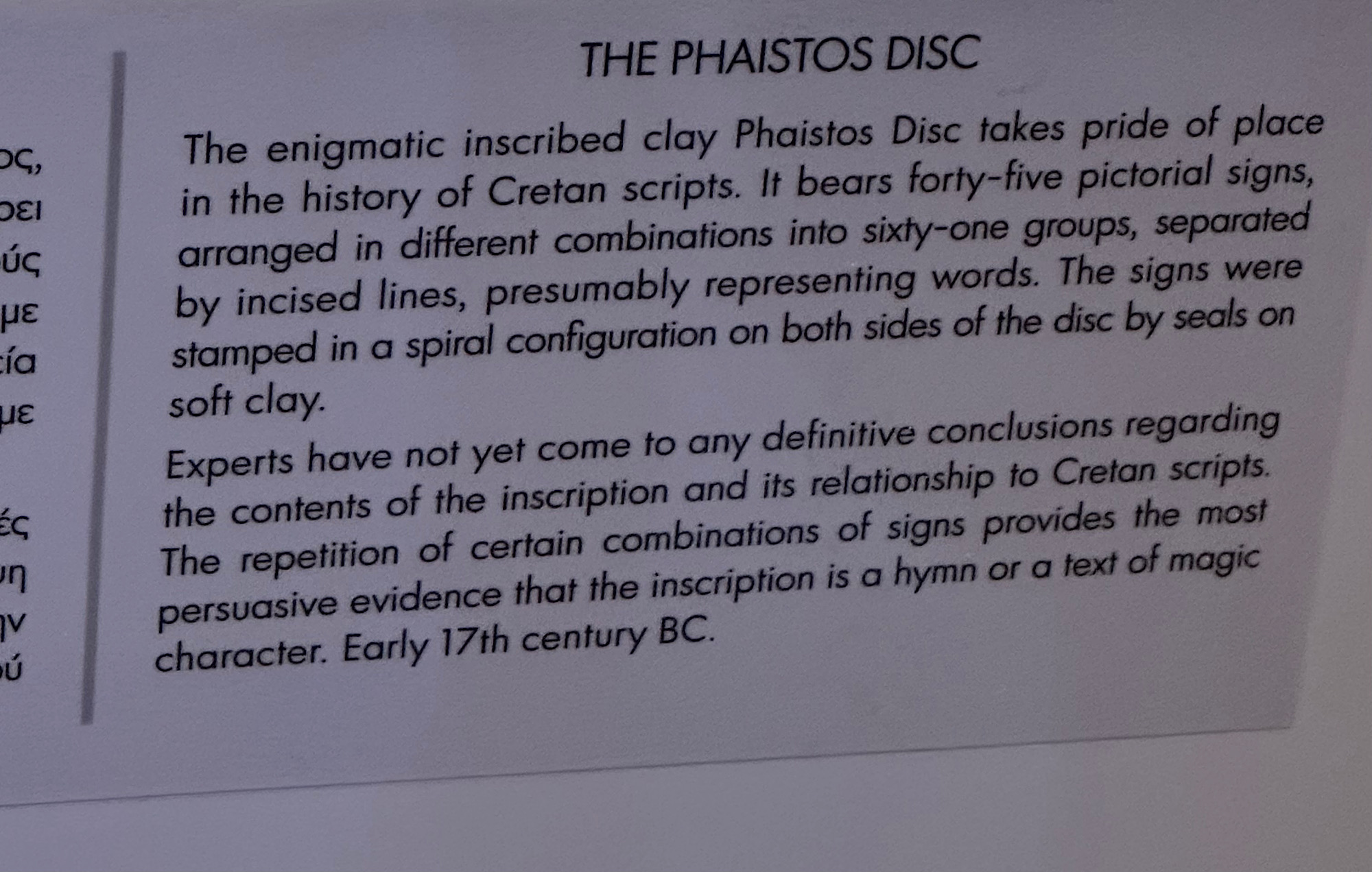 IMG_8560 Published November 12, 2025 at 2000 × 1272 in October 20, 2025: The Minoan Civilization on Crete. ← Previous / Next → Description of the Phaistos Disc from 1700BCE.