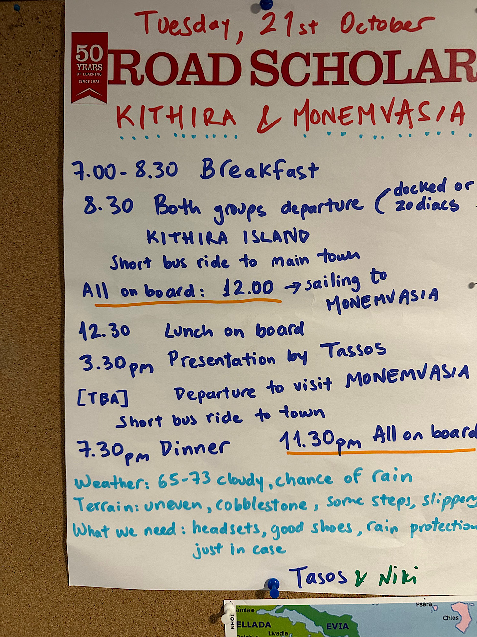 IMG_8590 Published November 12, 2025 at 975 × 1300 in October 21, 2025: Onward to Kythira and Monemvasia ← Previous / Next → Today’s agenda.