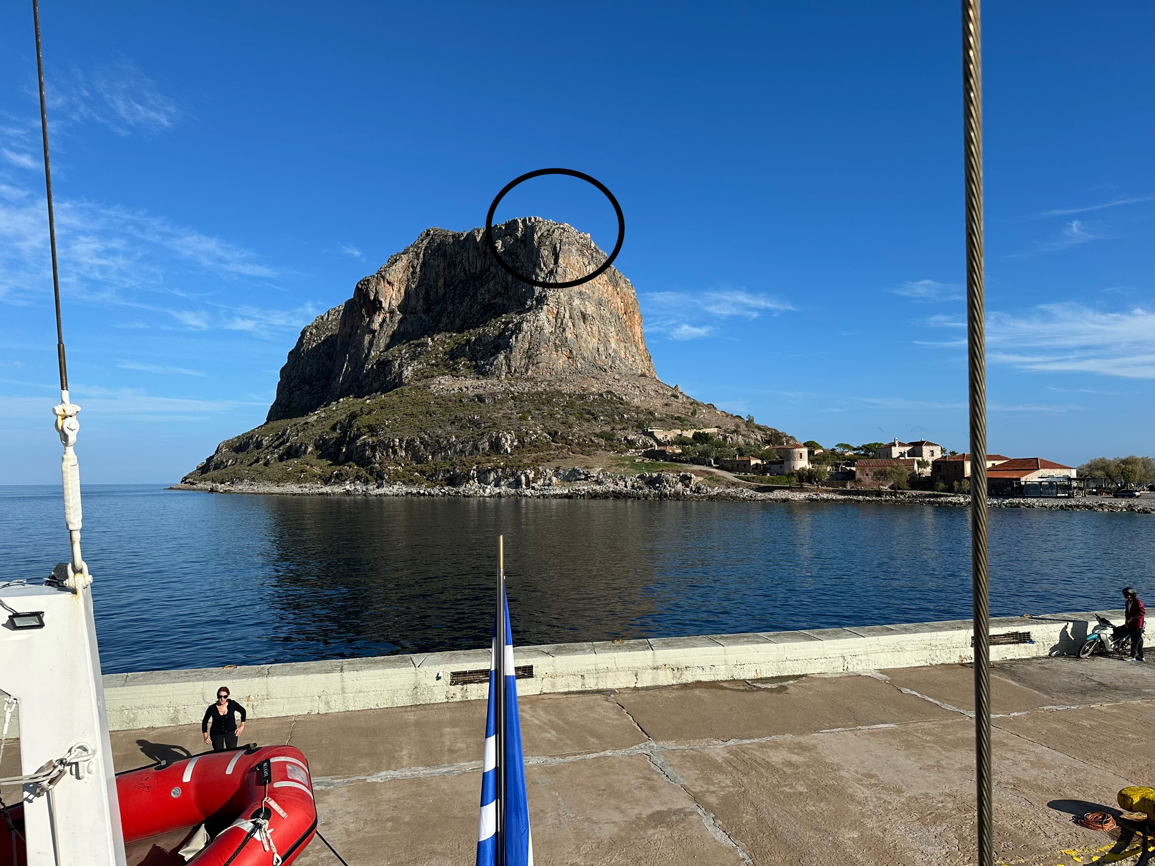 IMG_8615 Published November 13, 2025 at 2272 × 1704 in October 21, 2025: Onward to Kythira and Monemvasia ← Previous / Next → The island of Monemvasia. We are headed to the top of the mountain to visit the ancient fortress there.
