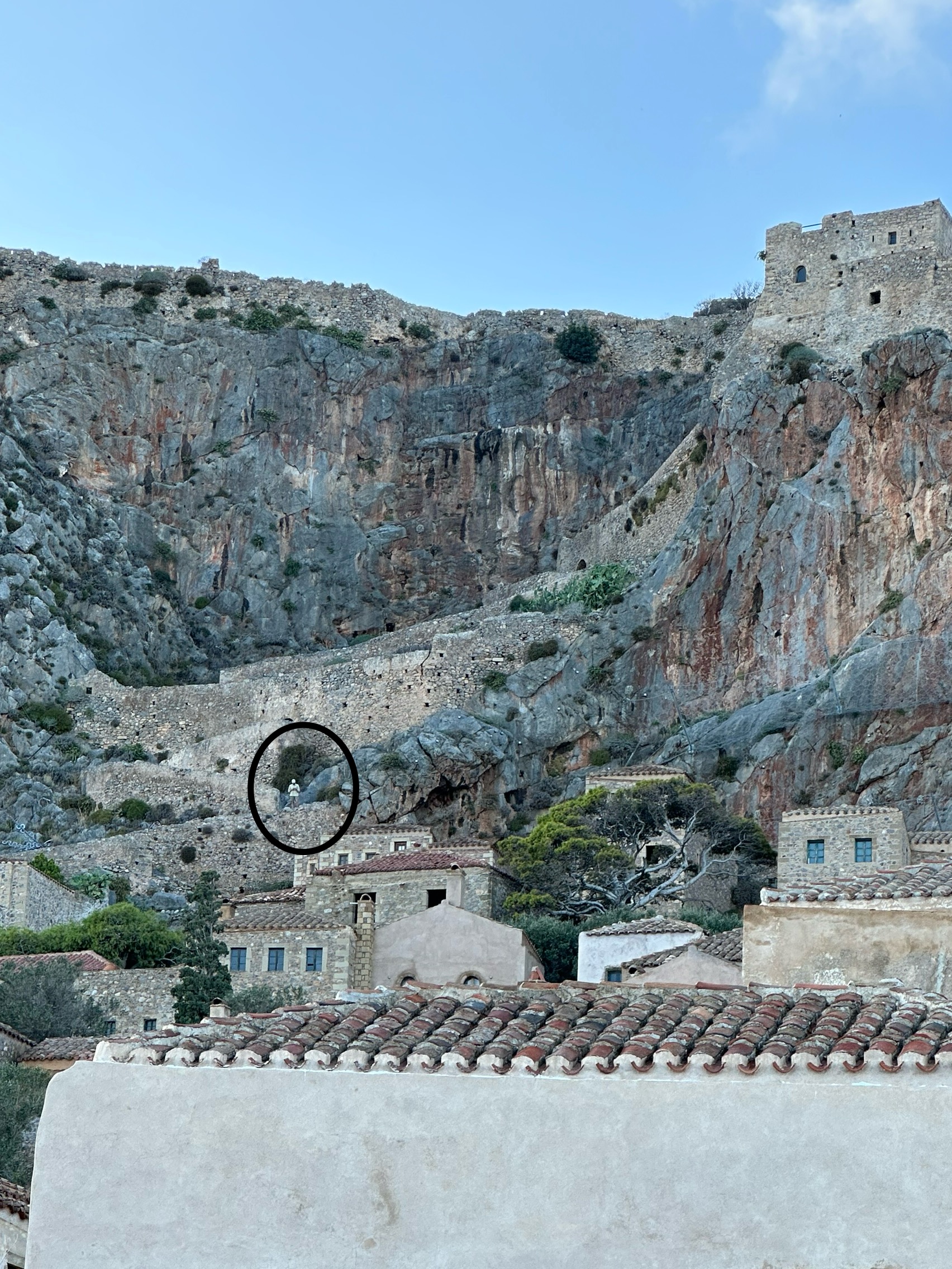 IMG_8647 Published November 13, 2025 at 1704 × 2272 in October 21, 2025: Onward to Kythira and Monemvasia ← Previous / Next → The figure in the circle walking up to the upper fortress. We passed on the opportunity.