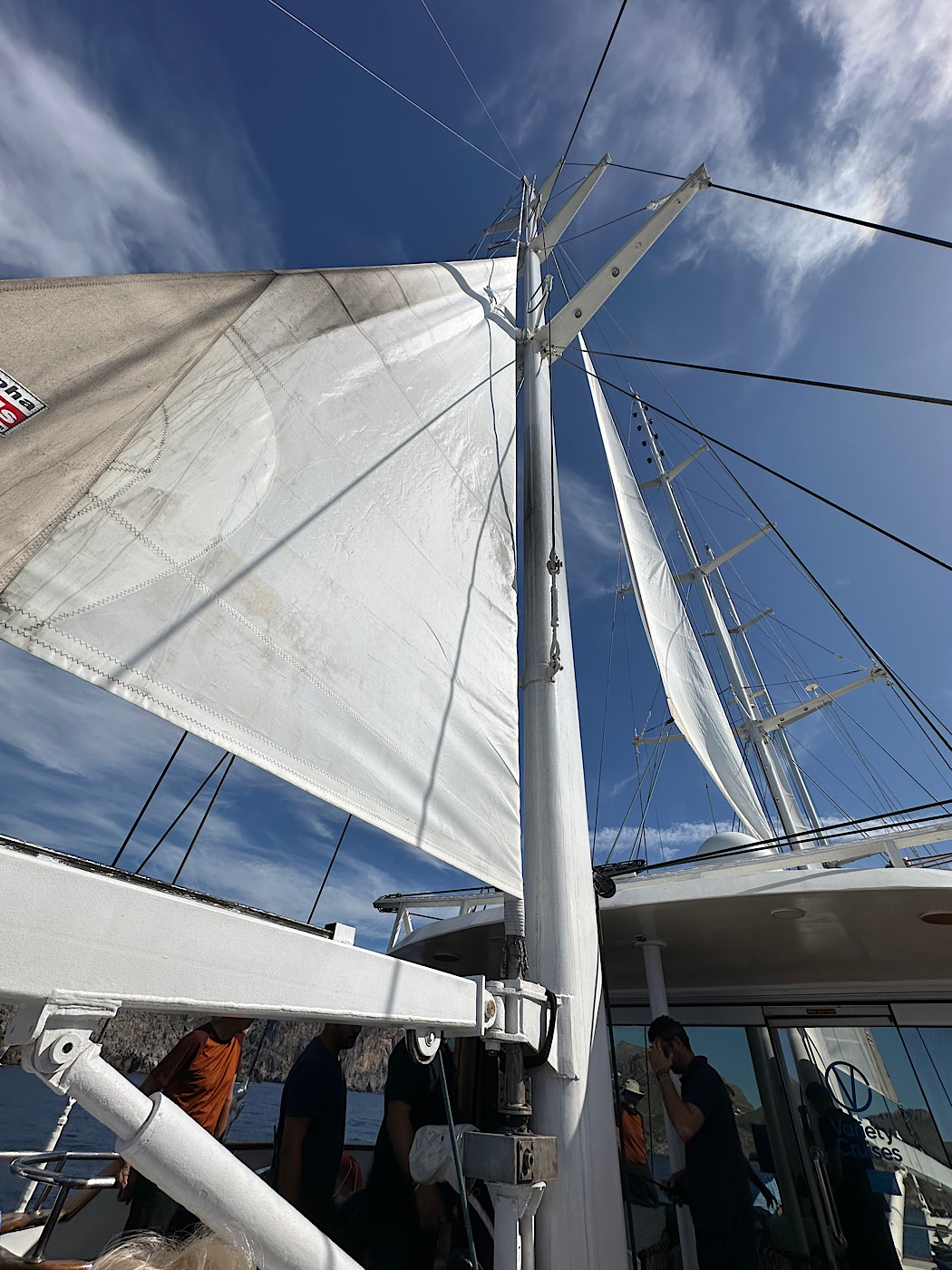 IMG_8652 Published November 12, 2025 at 1050 × 1400 in October 21, 2025: Onward to Kythira and Monemvasia ← Previous / Next → Finally the capitan has raised the sails! He still kept the engine running.