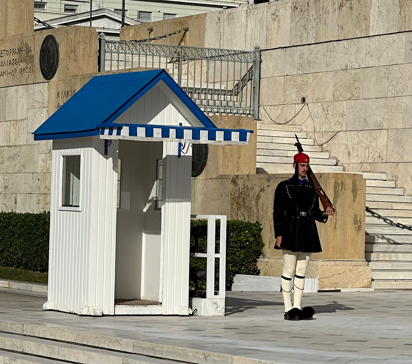 IMG_8925 Published November 17, 2025 at 1400 × 1237 in October 24, 2025: Back to Solid Ground and More Athens Sightseeing. ← Previous / Next → Greek guards at the Parliament. They change guards every hour.