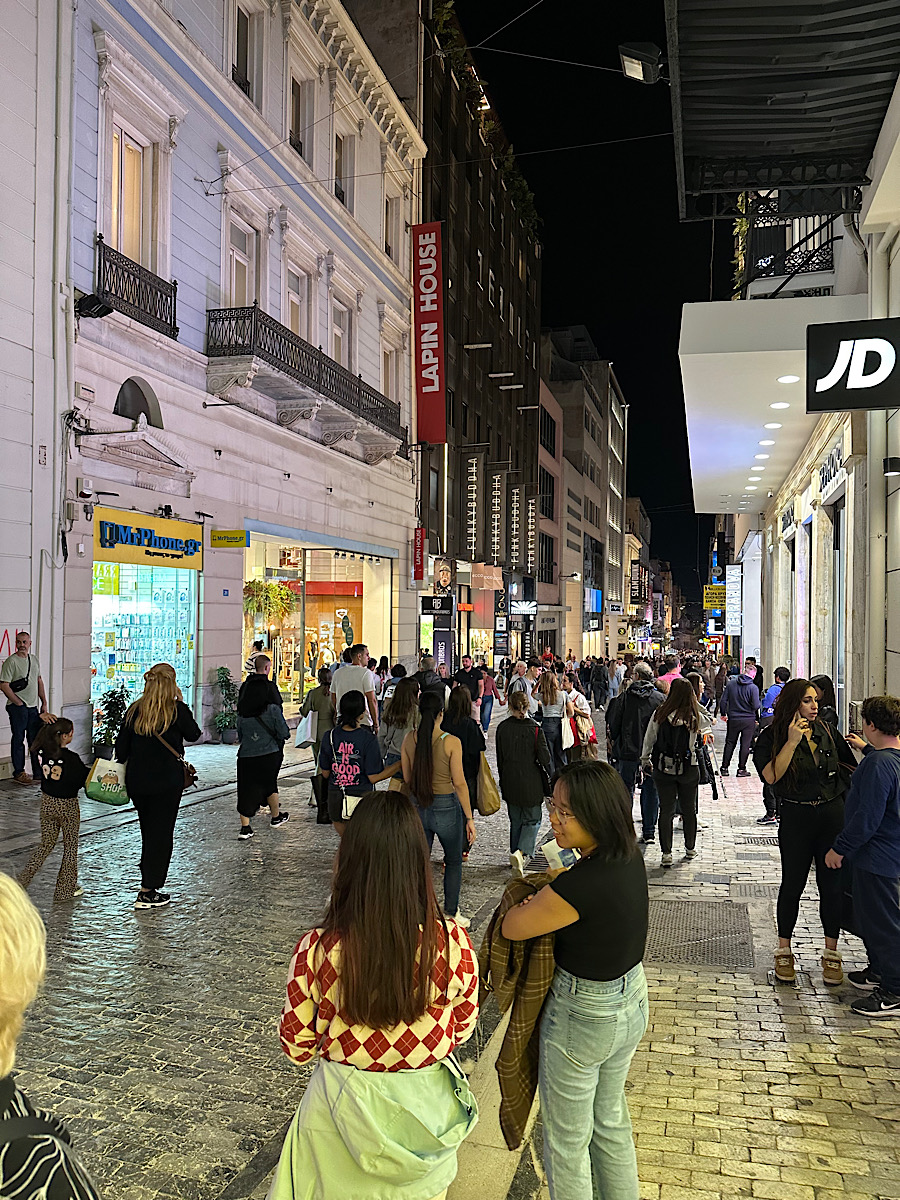 IMG_8944 Published November 17, 2025 at 900 × 1200 in October 24, 2025: Back to Solid Ground and More Athens Sightseeing. ← Previous / Next → After dinner walkers on the pedestrian walkway. It is Friday night after all!